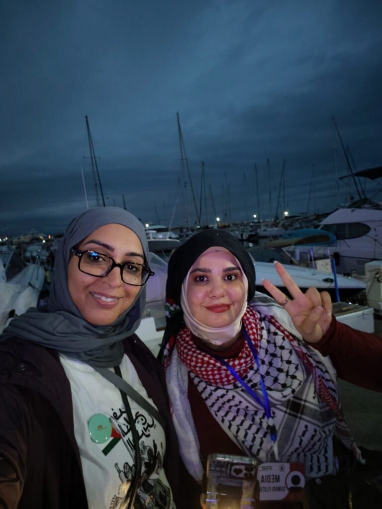نقف اليوم جنبا إلى جنب مع اخوتنا التوانسة والجزائريين والليبيبن والمغربيين والاندونيسيين والجنوب أفريقيين والايرانيين والأتراك لاستقبال أولى سفن أسطول الصمود القادمة من برشلونة قبل التحاق الوفود المتبقية معها.